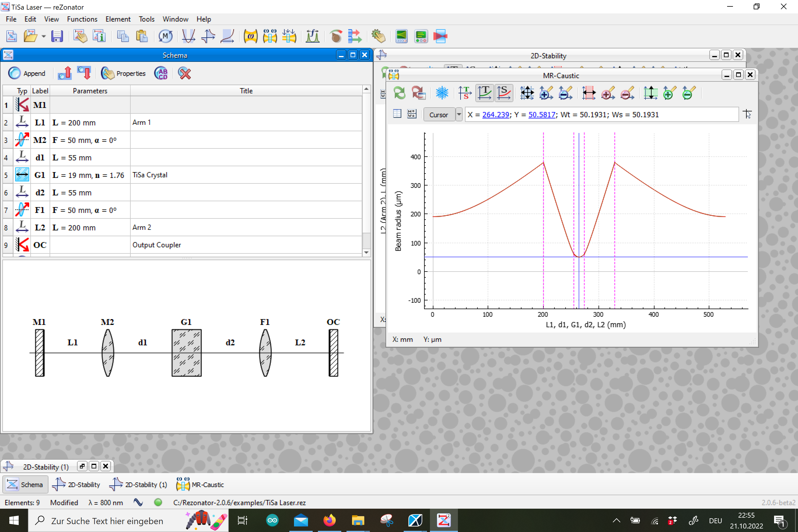 whilst I am working on the DPSS Nd:YAG Laser, I am planning a DPSS Titanium Sapphire Laser, cw at first, possibly modelocked later. I have actually already made a few crude experiments which did not succeed. I do have a 19mm long Ti:Sa crystal (chipped at one edge, only 4x4mm usable aperture, which is a bit scratched up) and the mirrors for a x-fold resonator (2x concave R=100, AR VIS, HR NIR; 1 HR NIR plano; 1x OC 95%R NIR plano). Also, I’ve got a NDG7475 1W 520nm diode. With those elements I have tried the x fold (really difficult to align) and an experimental hemispheric resonator. Neither have succeeded. I suspect that the available pump powers and the high OC transmission play a role. The crystal may be very long, but it is doped in such a way, that is aborbs ~70% green (54% blue), just like shorter crystals. So the only problem is getting the rayleigh length of the pump long enough to sufficiently pump the whole crystal.