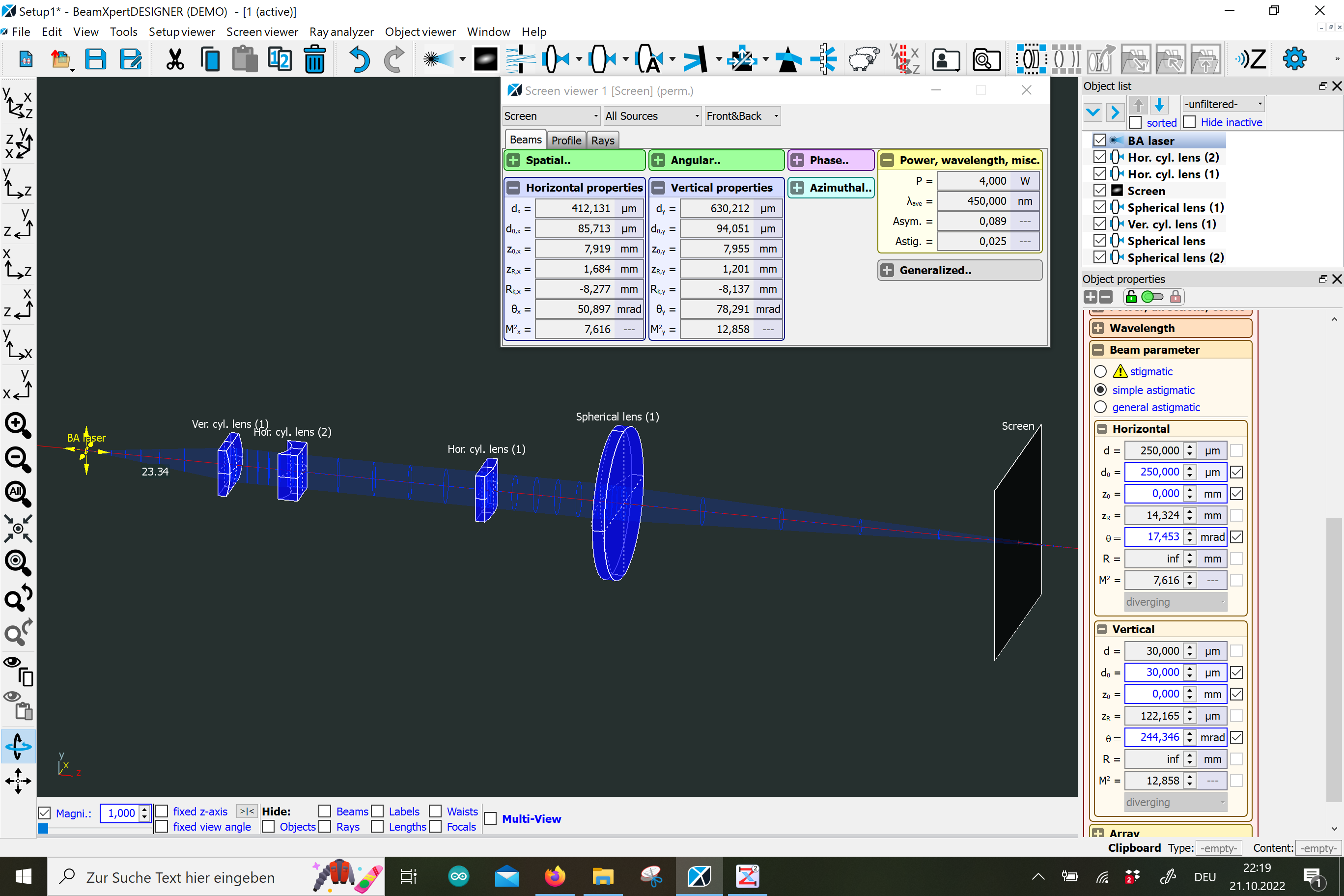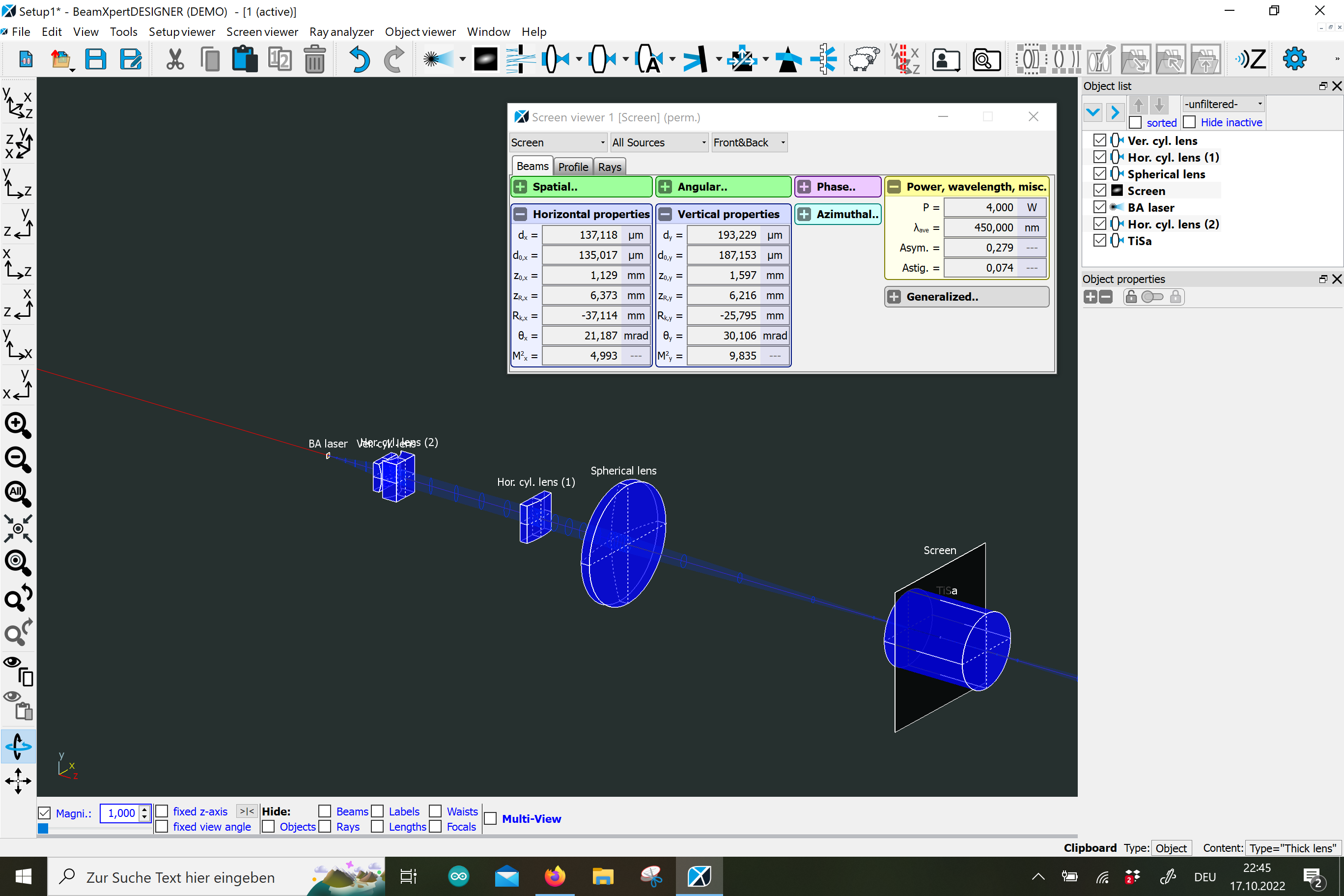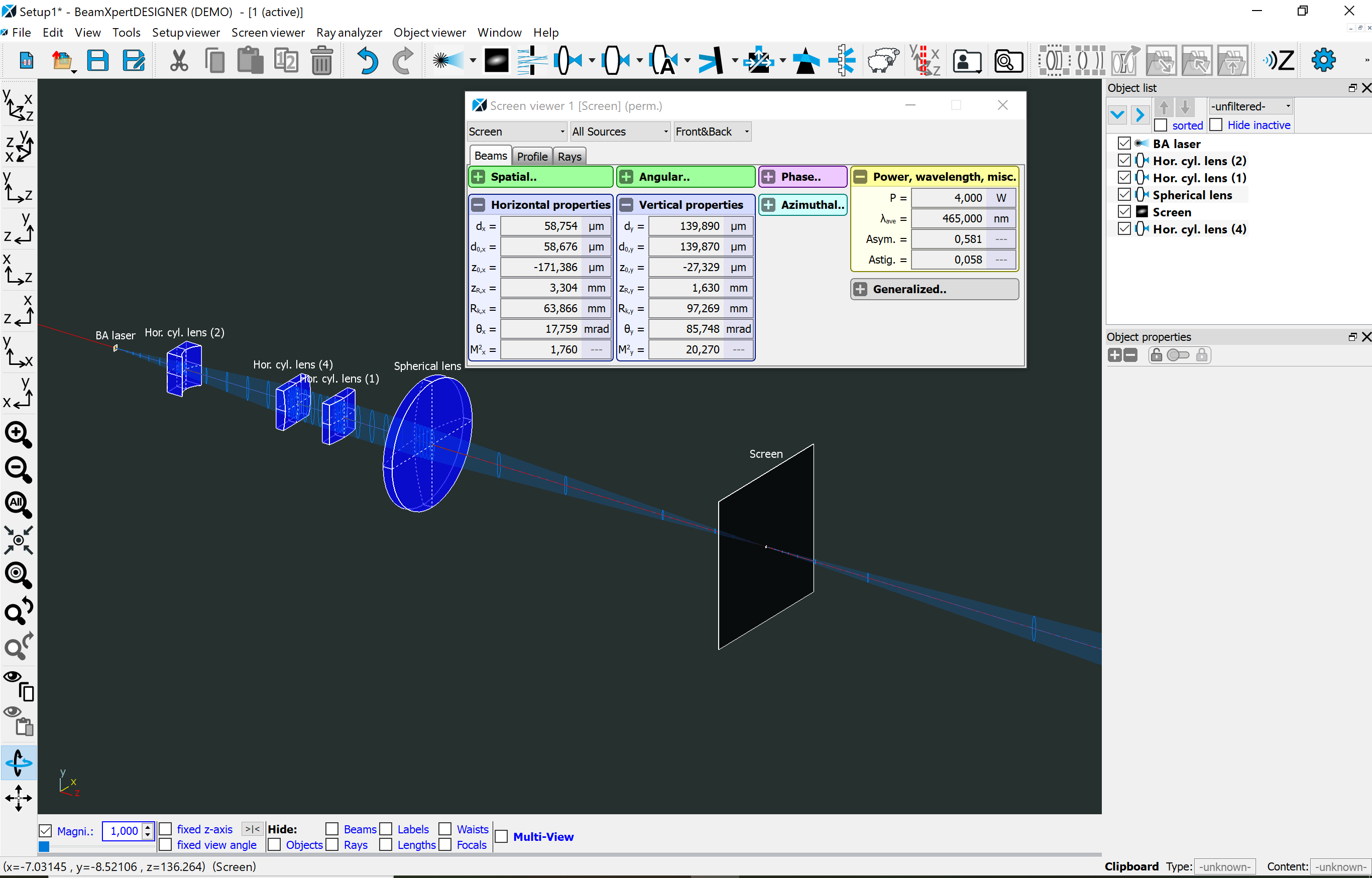 Finally, I simulated the beam propagation using BeamXpert DEMO (thanks builder!!) and tried many combinations of the lenses that Phillip has available until I found a combination that works well enough imo: