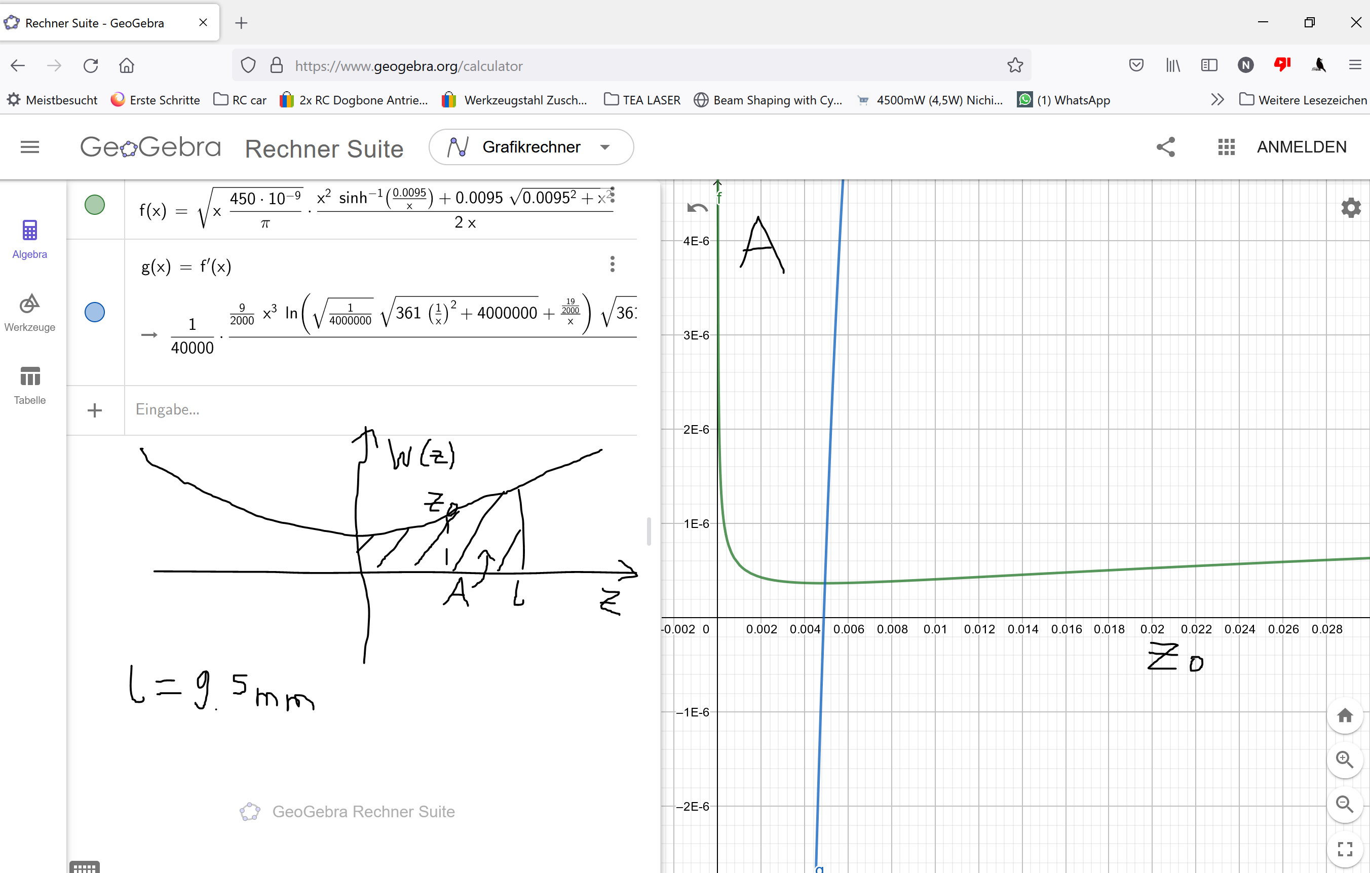 The scribbled graph is the beam waist w(z) on the y axis and the progagation length z on x. The area A is the pumped region (2D-simplication) within the crystal, at z=0 lies the focal point and at z0 lies the rayleigh length… Actually, the absorbed pump beam would be from z=-l to z=l and from w(z) to -w(z) but because of symmetry this simplication works for the following thoughts. Now what I want, is to minimize A to get maximum average power density in the pump beam. I can’t just make the focal spot really small since the rayleigh length would decrease and the edges of the crystal would not be pumped well (and vice versa). So there must be an optimal rayleigh length z0 for a given l. So I integrated w(z) (for gaussian beams, not true here, but an approximation) from 0 to l to get A. A then is an expression dependent on wavelength (given: 450nm), l (given: 19mm/2=9.5mm) and the rayleigh length z0. Thus, the only variable is z0 and I can plot this in 2D. Remember, I want to minimize A so I find the lowest point of the curve A(z0). I can already see this point at z0=5mm, but let’s have fun and derive A(z0). A(z0) is minimum (or max), when A’(z0)=0. This is, again, at z0=5mm.